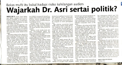 Merujuk kepada tulisan saudara Yusri Mohamad dalam ruangan forum di Utusan Malaysia bertarikh 23 Jun 2010 menyebabkan penulis rasa terpanggil untuk memberikan pandangan balas berkaitan isu yang ditimbulkan olehnya. Isu utama yang dibangkitkan oleh saudara Yusri ialah berkaitan cakap-cakap politik yang menyebut Dr Asri (mantan Mufti Perlis) akan menyertai UMNO pada hari jumaat ini bersama dengan 100 orang alim ulama’ berkelulusan tinggi. Usai membaca ulasan beliau, dapat kita faham tentang beberapa hal penting yang ditekankan terutamanya berkaitan manhaj yang dipegang oleh Dr Asri yang didakwa sebagai syaz (ganjil) dan juga akan merugikan kedua-dua parti politik, secara jelas beliau menyebut nama parti UMNO dan juga Pas.